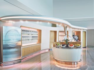 モエ・エ・シャンドンとエミレーツの長期に渡るパートナーシップが実現させた「シャンパンラウンジ」。シャンパンを引き立てるカナッペなども用意されている。