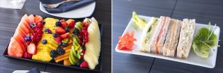 機内食として提供されたフルーツの盛り合わせとサンドイッチ。軽食程度の内容でも、しっかりと盛り付けまでこだわっており、見た目にも美しい。
