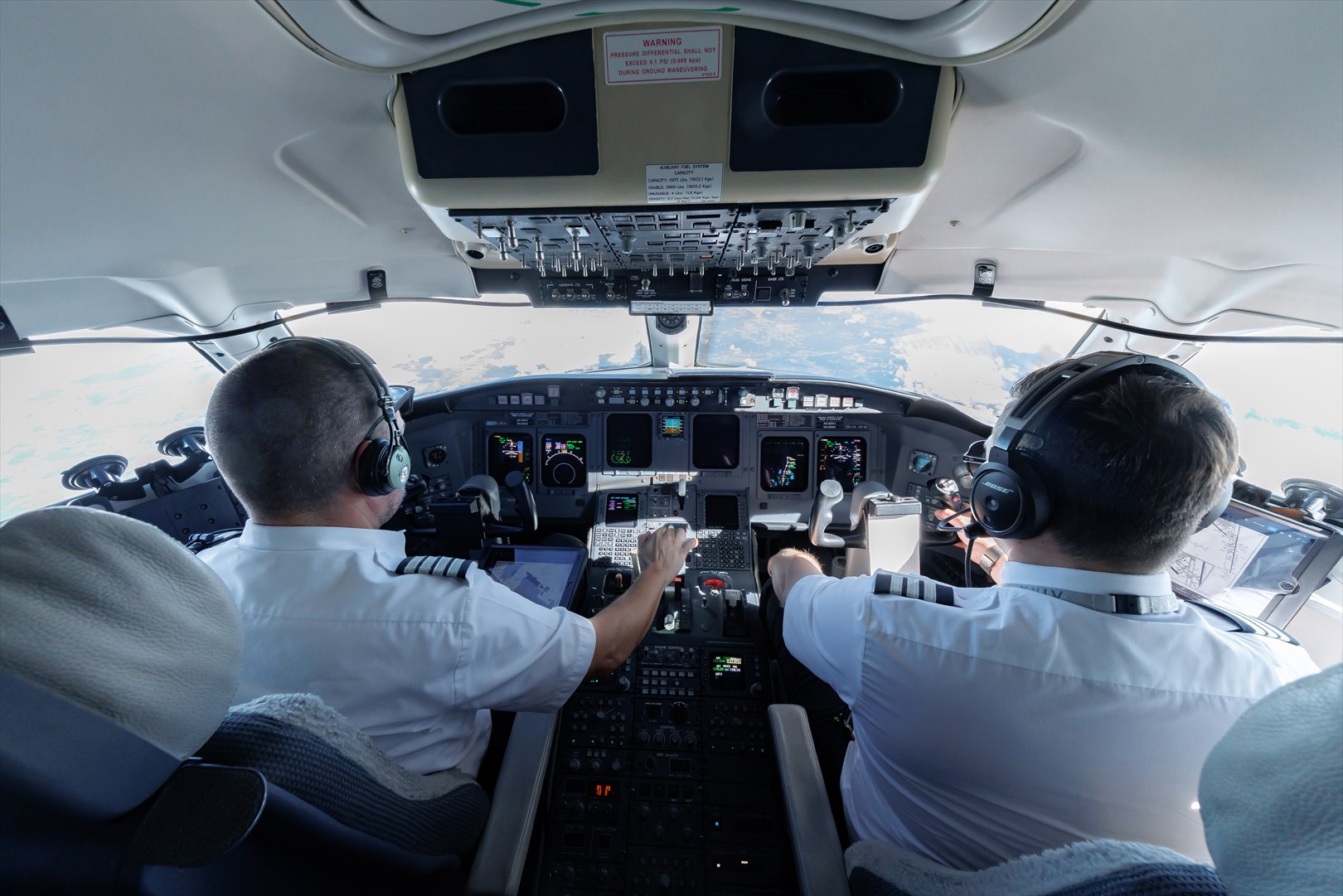 容易に飛行中のコクピット撮影が可能なこともプライベートジェットならでは。CRJ200がベースになっていることから、コクピットのアビオニクスは90年代の雰囲気が感じられる。