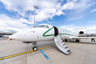 ウィーン国際空港到着時の様子。同空港には、プライベートジェット専用の駐機エリアも存在するが、Challenger 850はプライベートジェット機の中では大型であるためか、旅客便と同じエプロンへの駐機になった。
