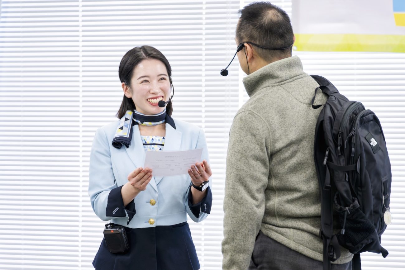 どのような乗客を担当するのかは、実際の審査の順番が回ってくるまでわからない状態、予測不能な質問がある中でも、普段通りの接客スキルを発揮し柔軟に対応していた。