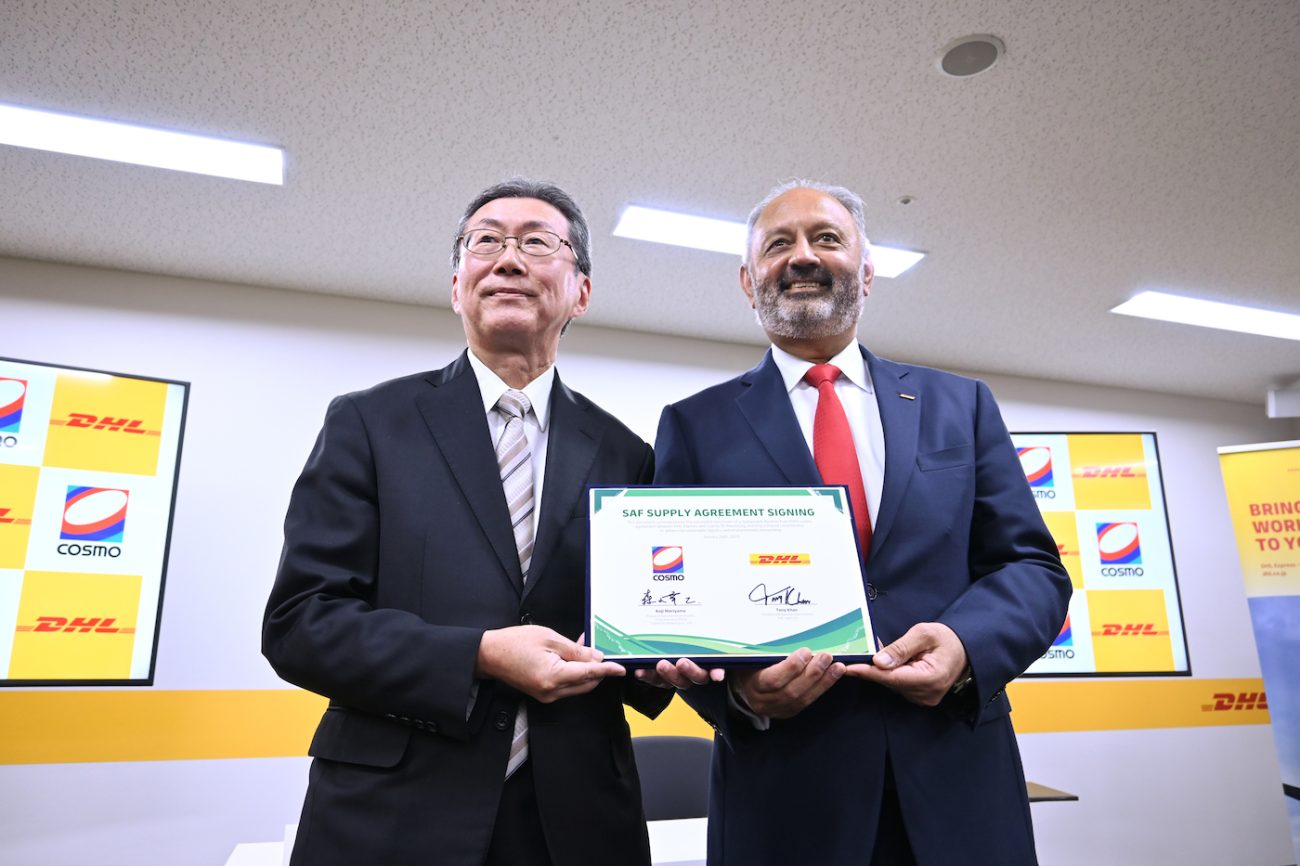 中部国際空港での国産SAF運用開始に先立つ2025年1月28日、DHLジャパンのトニー カーン代表取締役社長とコスモ石油マーケティングの森山幸二 代表取締役社長(当時)が年間720万リットルの調達契約を締結した。