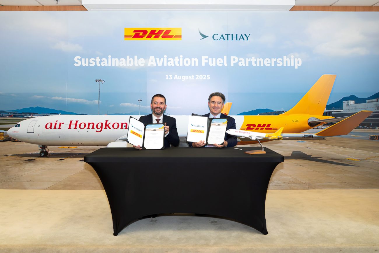 2025年8月13日、DHL ExpressとキャセイグループがSAFのパートナーシップ契約を締結。エアホンコンが成田、仁川、シンガポールの3空港発のフライトで使用する約310万リットルのSAFをキャセイグループが供給する内容だ。