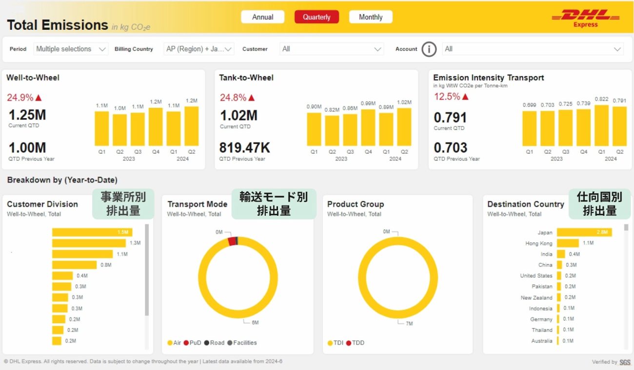 DHLジャパンでは、DHLアカウントを保有する全ての顧客を対象に、温室効果ガス排出量を見える化した『排出量レポート』を無料で提供している。ここでは顧客ごとの出荷データが可視化され、年間排出量や貨物ごとの排出量、仕向国別の排出量といった項目ごとに、排出量データを詳細に確認することができる。