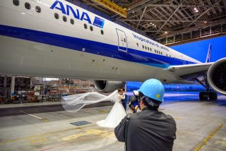 ANAが夜の羽田空港格納庫で開催したウェディングフォトツアー。参加した辻本直人さん、沙苗さんご夫妻が777-300ERを背景にウェディングフォトを撮影した。