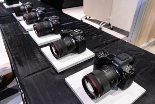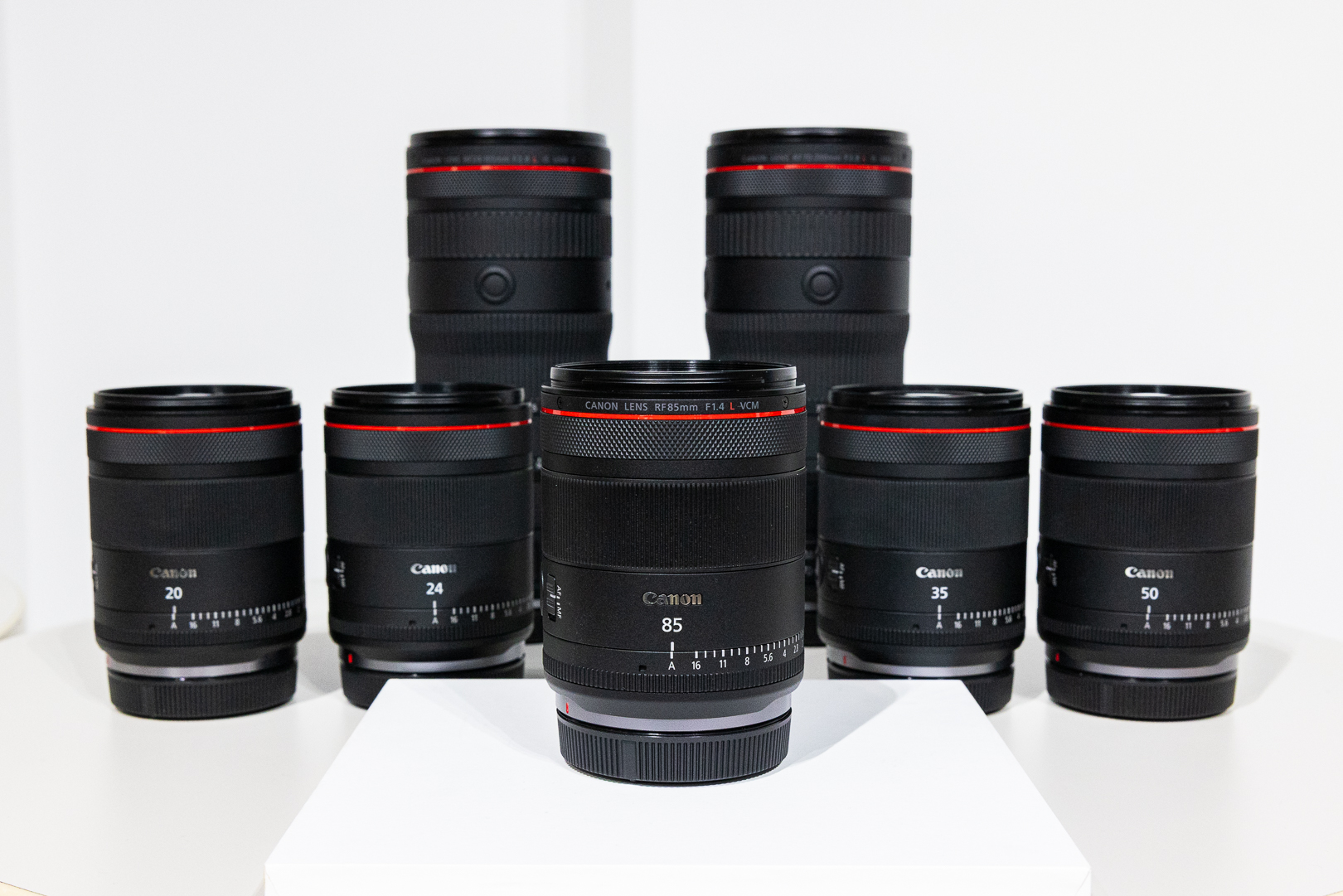 RF F1.4 L VCMシリーズ、奥から20mm・24mm・35mm・50mm、そして今回発表された「RF85mm F1.4 L VCM」。サイズは共通のため、フィルター類ももちろん使い回しが可能だ。