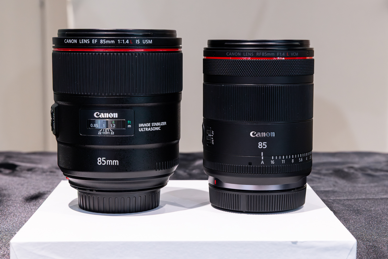 数値上はそこまで大きくないように見えても、並べてみれば「EF85mm F1.4L IS USM」とのサイズ差は一目瞭然。同レンズと比較し、画面全域で高画質化を実現したほか、最短撮影距離も10cm縮まった75cmとなっている。