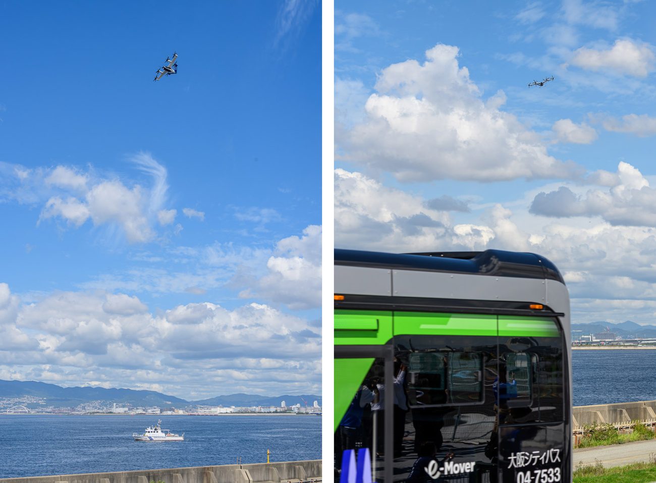 9月30日のデモでは、11時09分に離陸して、万博会場の沖合いを時計回りに高度400フィート、速度170km/hで12分48秒間フライト。来場者によく見てもらおうと、通常よりも速度を落として飛行したという。