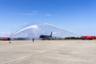 消防車の放水アーチを受けて、仙台空港の12番オープンスポットにブロックインするSFJ97便。