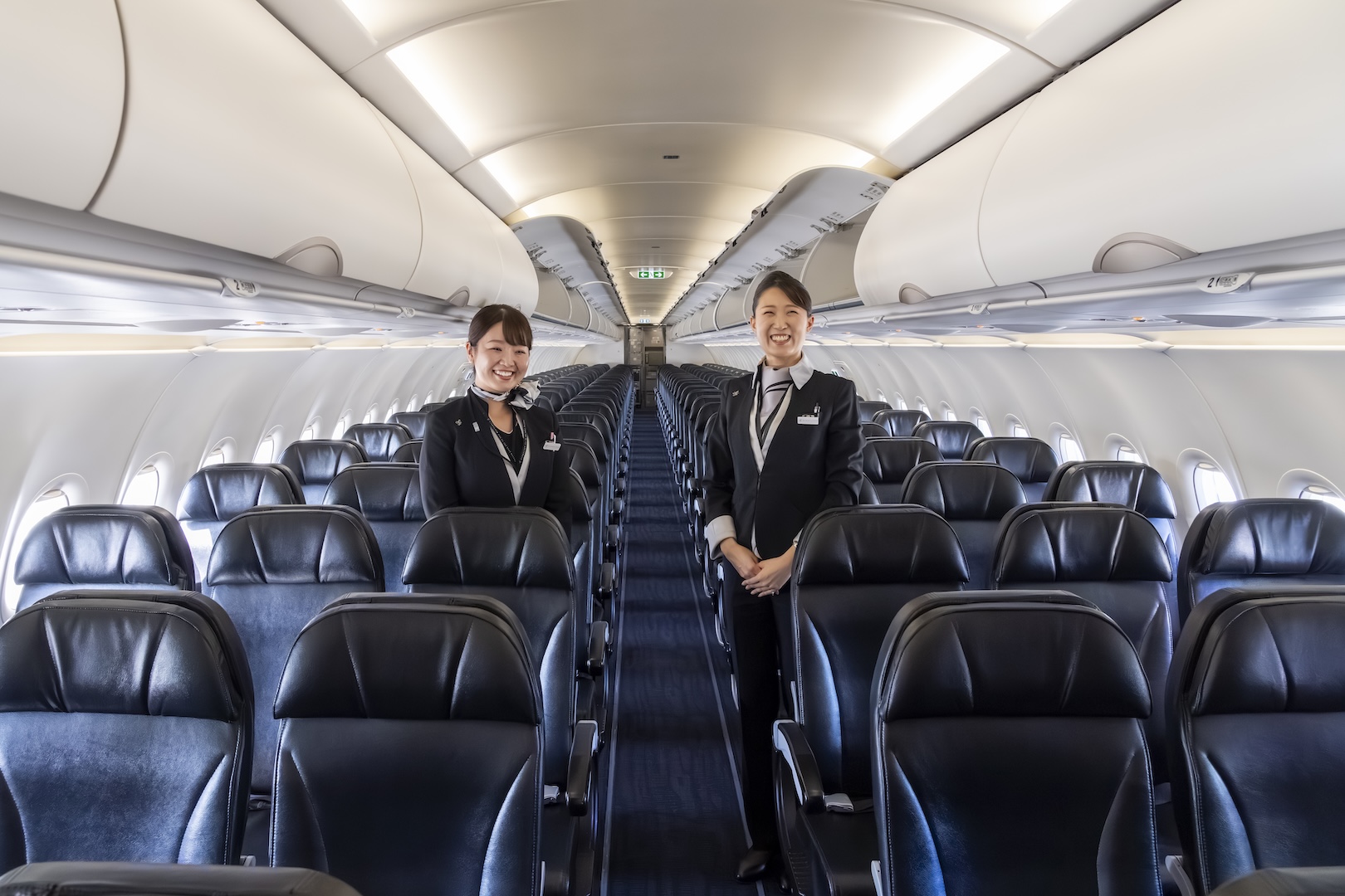 レザー仕様の黒いシートと白の内壁が落ち着いた雰囲気を感じさせる機内。この日は機内見学会も行なわれ、客室乗務員による客室サービスを体験する機会も設けられた。