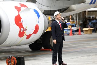 JALミャクミャクJETさよならイベント開催の挨拶にたつ株式会社ジェイエアの宝本聖司 取締役。