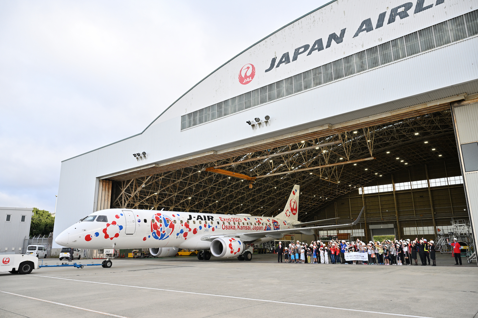 イベントを終えて、特別塗装機としてラスト2日間のフライトへ向かうJALミャクミャクJETと、そのハンガーアウトを見送る参加者たち。