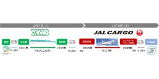 輸送イメージ。10月7日、仙台駅12時01分発のやまびこ212号で東京駅へ輸送し、その後羽田0時05分発のJAL35便でシンガポールに6時10分に到着する。