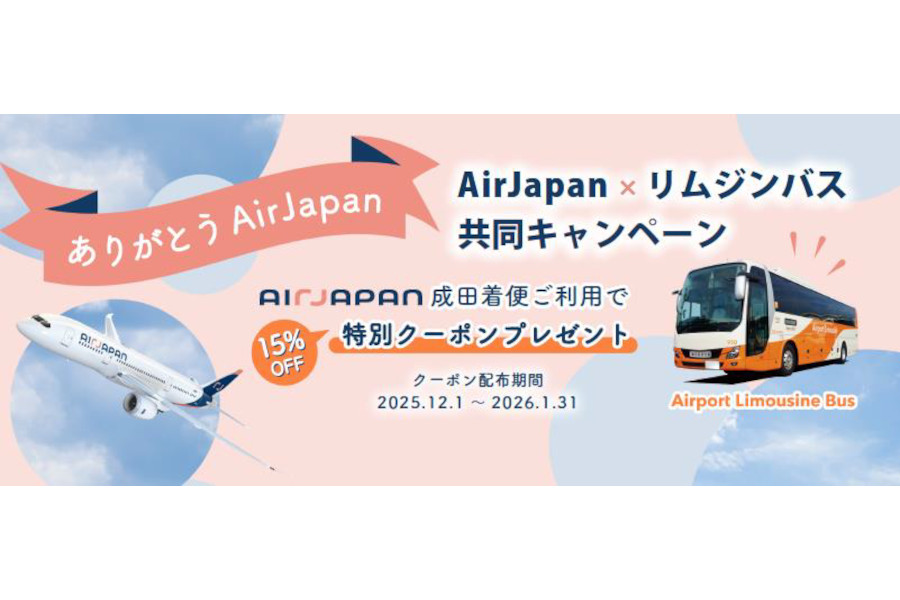 AirJapanと東京空港交通リムジンバスは、12月1日から2026年1月31日まで、成田空港到着客を対象とした初の共同キャンペーンを行うと発表した。期間中、バンコク・シンガポール・ソウル(仁川)発のAirJapan便で成田に到着した乗客全員に、成田空港から東京都心へ向かうリムジンバスの運賃が15%引きとなる特別クーポンが、機内で配布される。