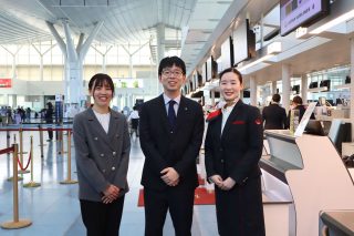 左から、音声文字化機器を体験した坂上さん、運用を企画した藤田さん、グランドスタッフの葛西さん。
