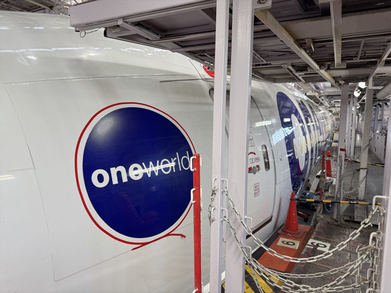 足場の間から姿を見せる「oneworld」のロゴ。キャビンの窓はすべてマスキングが施されている。