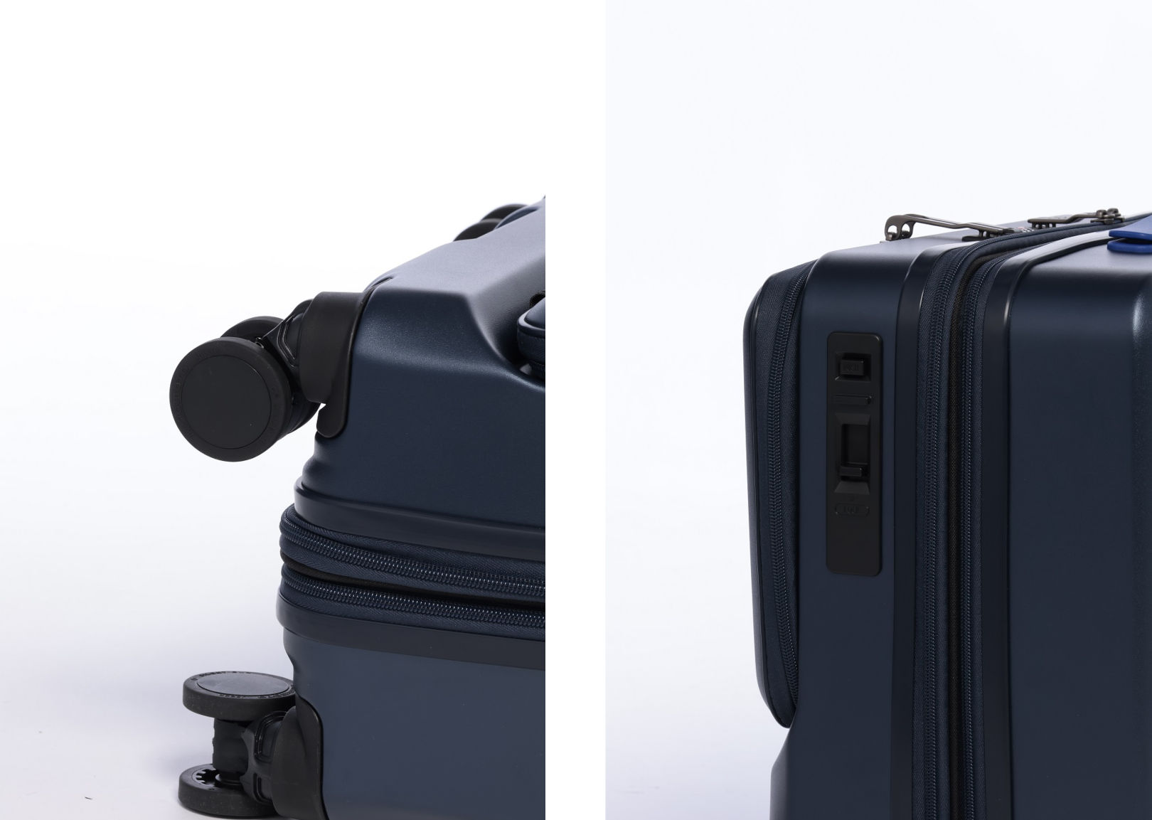 2段階調節キャリーハンドルやボトムハンドルを備え、内装には飛行機柄の生地を採用するなど細部にまでこだわったデザイン。