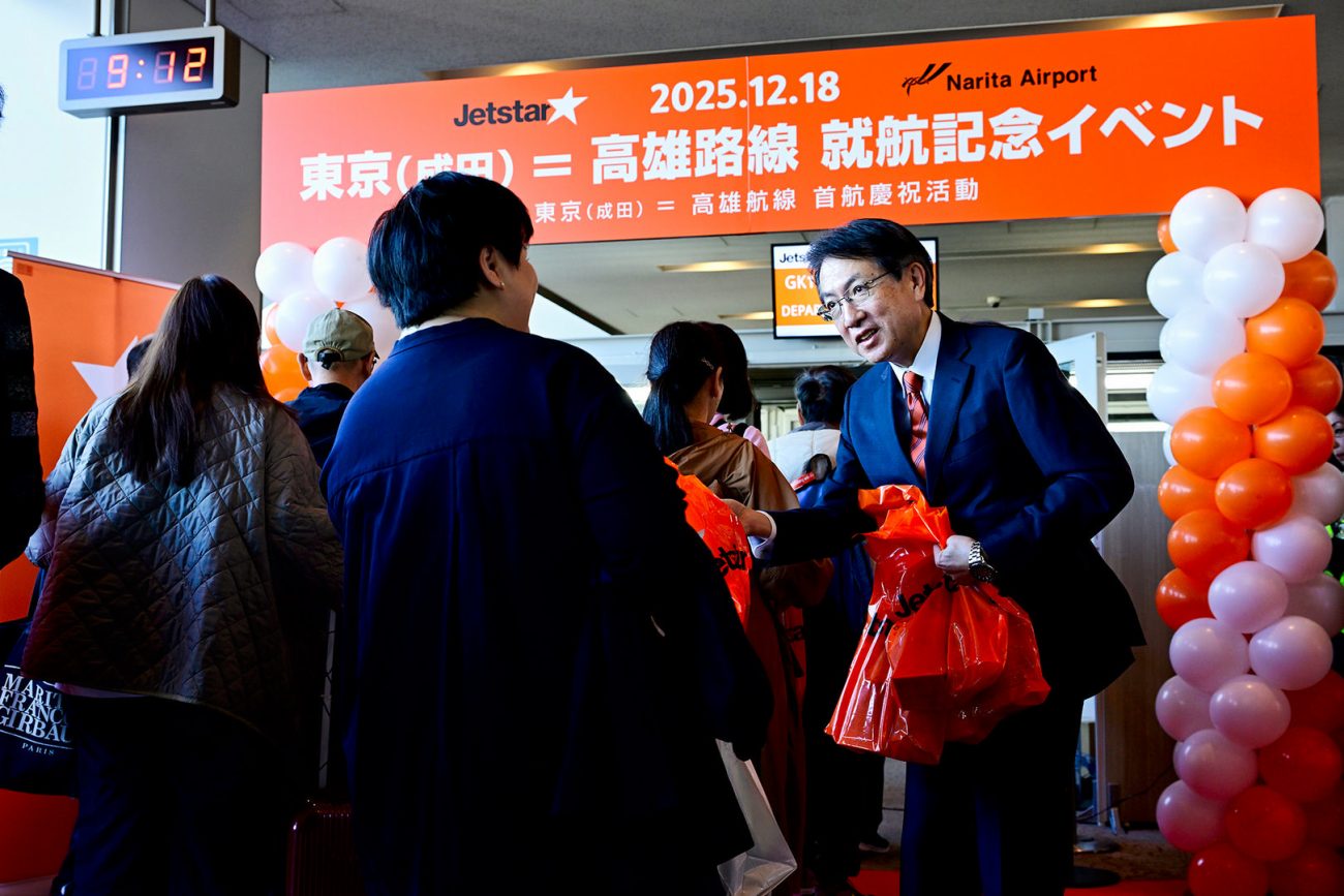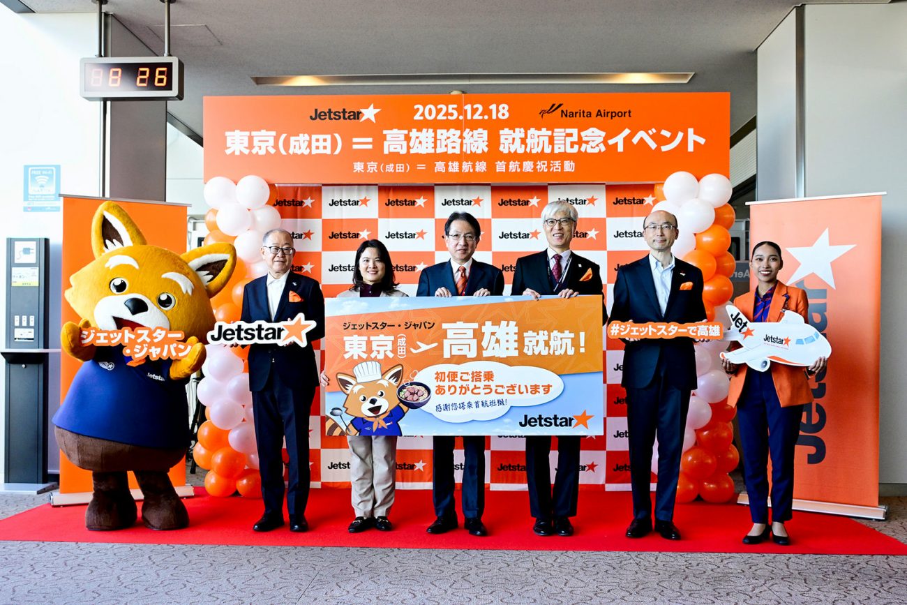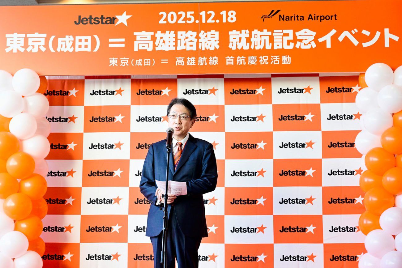 快晴の成田空港、2025年12月18日。「ジェットスター・ジャパンにとって8年4か月ぶりの国際線新規就航路線の誕生です」。ジェットスター・ジャパン 取締役会長の阿部孝博氏は成田空港第3ターミナル152番搭乗口前に設置された、成田=高雄線 就航記念イベントのステージにて力強く挨拶した。コロナ禍を経て、ようやくここまで来た、という万感の思いもあるだろう。
