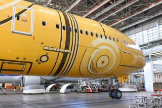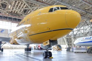 格納庫内で他のANAフリートとともに並ぶJA743A。青を基調としたANA機の中で、黄色塗装はまさに異色の存在であった。
