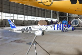 一足先にANA通常塗装にリペイントされた、ボーイング787-9 JA873A「R2-D2 ANA JET」のモデルプレーン。スター・ウォーズのキャスト陣のサインが入った豪華仕様である。