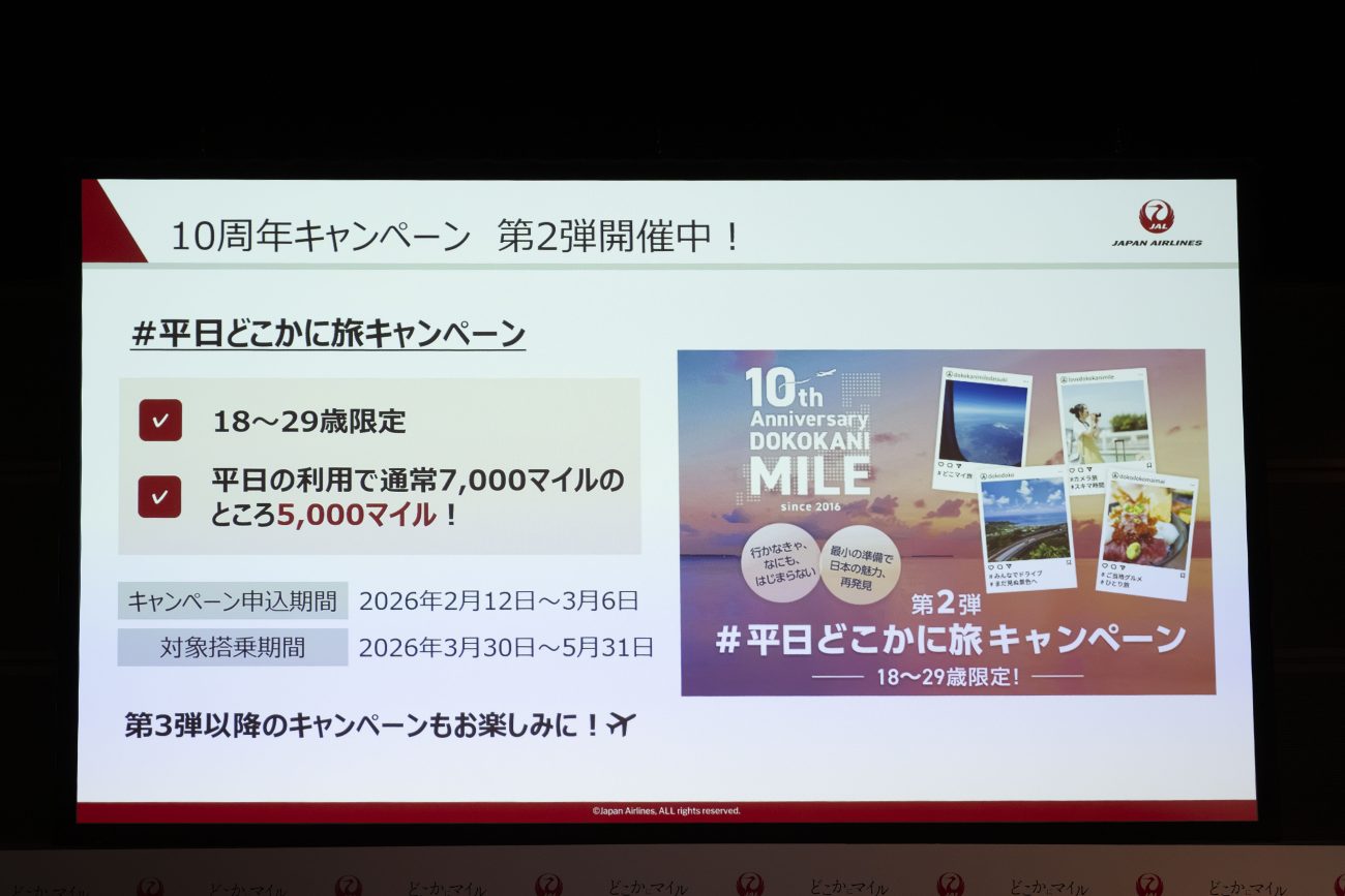 さて、同イベントは「どこかにマイル」の10周年を記念したキャンペーンの第1弾として開催された。現在は第2弾として「#平日どこかに旅 キャンペーン」を実施している。これは、18~29歳のJMB会員を対象に、通常7,000マイルが必要な「どこかにマイル」を平日の利用に限り5,000マイルで申し込めるクーポンをプレゼントするというもの。なお、キャンペーンの登録期間は2026年2月12日から3月6日までとなっている。