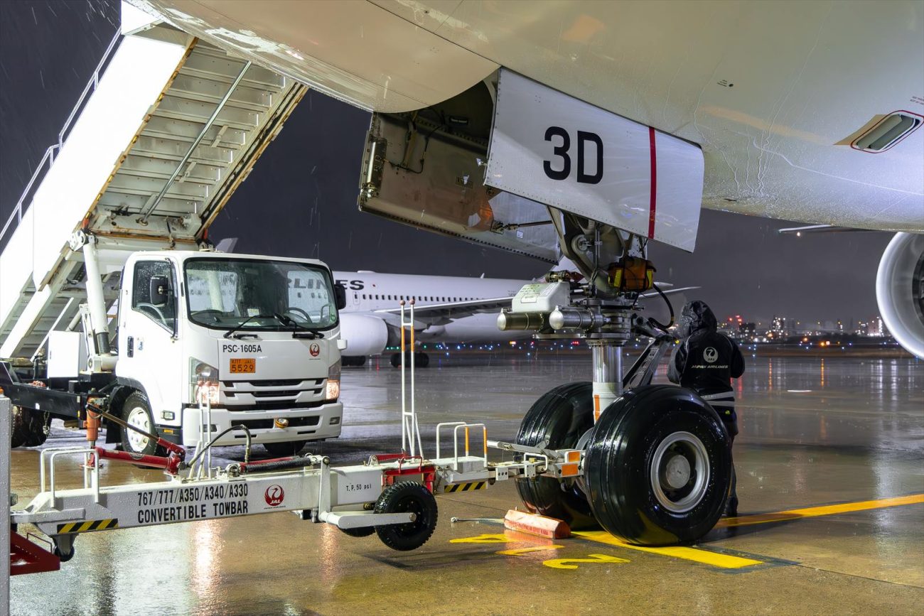 JA732Jの商業運航のラストフライトは2025年11月20日のJL52便(シドニー発羽田行き)。これまでの総飛行時間は8万9,860時間39分、総飛行サイクルは1万1,358回に及ぶ。退役後は羽田空港のJAL 格納庫にて退役整備が行なわれ、これまでの退役機と同様に再利用可能な部品の撤去や、一部座席の取り外し、タイトルやロゴを白く塗り直す塗装作業などが実施された(本誌4月号でも詳報している)。加えて今回は、バイヤーの希望によりランディングギアおよびエンジンの交換も行なわれている。約3か月にわたる整備期間を経て、今回の退役フェリーフライトを迎えた。