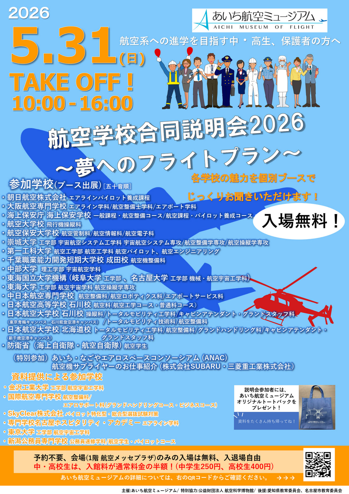 あいち航空ミュージアムでは、航空分野への進学・就職を希望する中学生・高校生を対象に、航空学校合同説明会を開催する。会場内に学校・団体ごとの個別ブースを設け、各学校の特長、入試科目、授業料、 学校生活、就職先等について説明する。