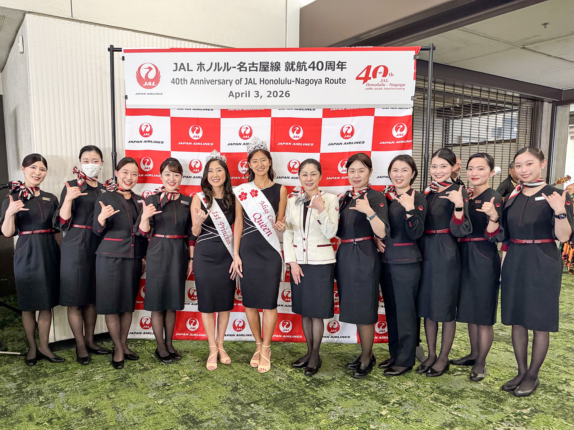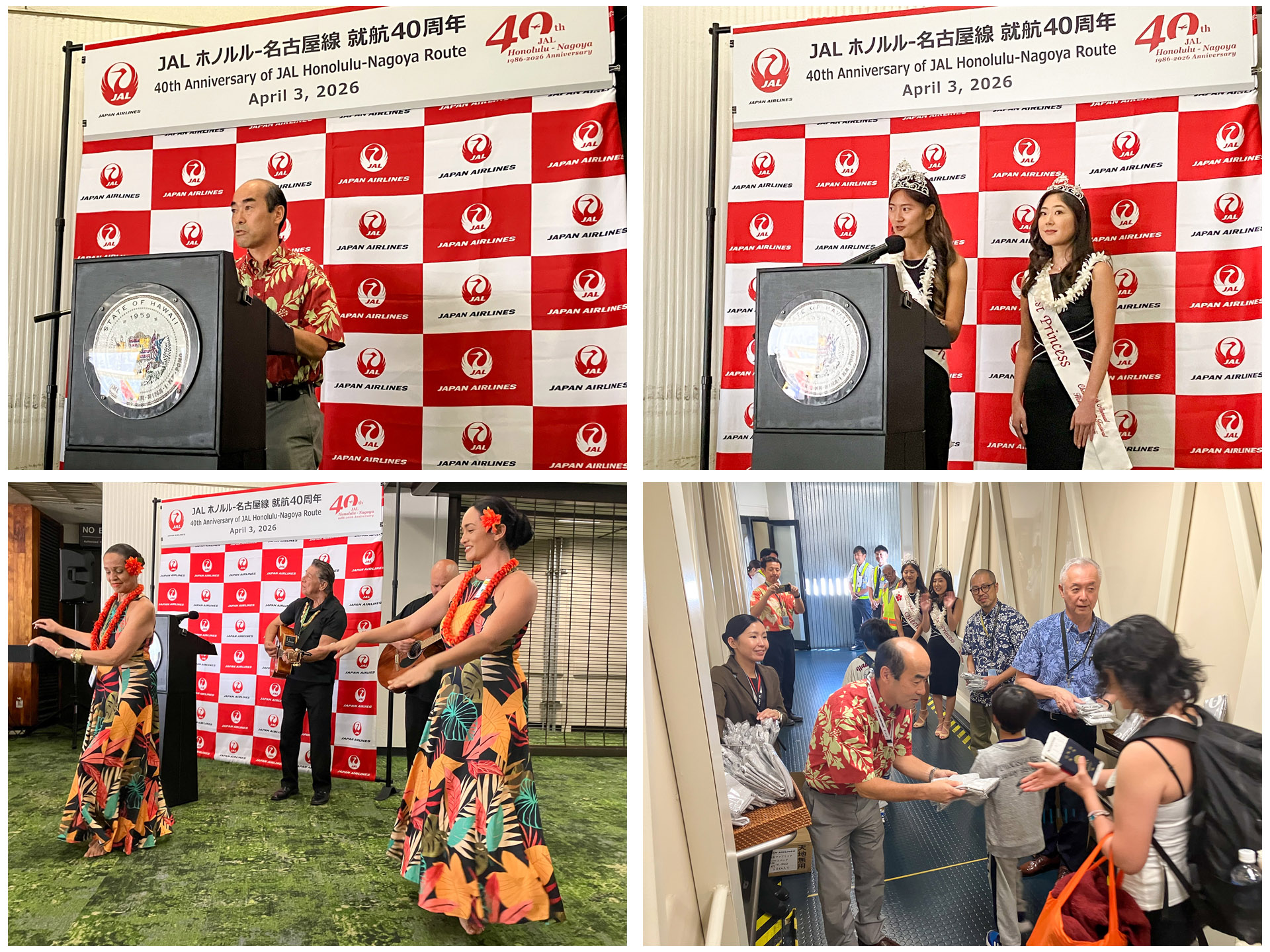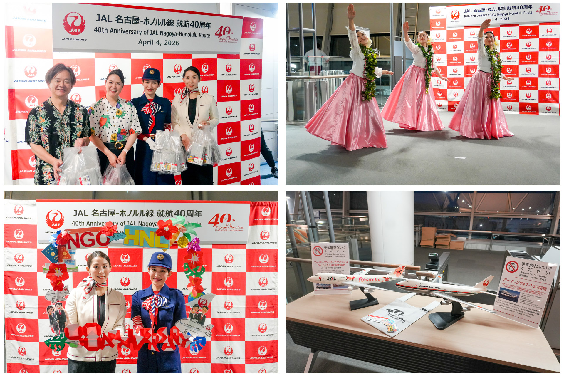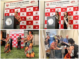 JALが名古屋=ホノルル線就航40周年を記念して、両地で記念セレモニーを開催。写真は中部国際空港でのセレモニー。