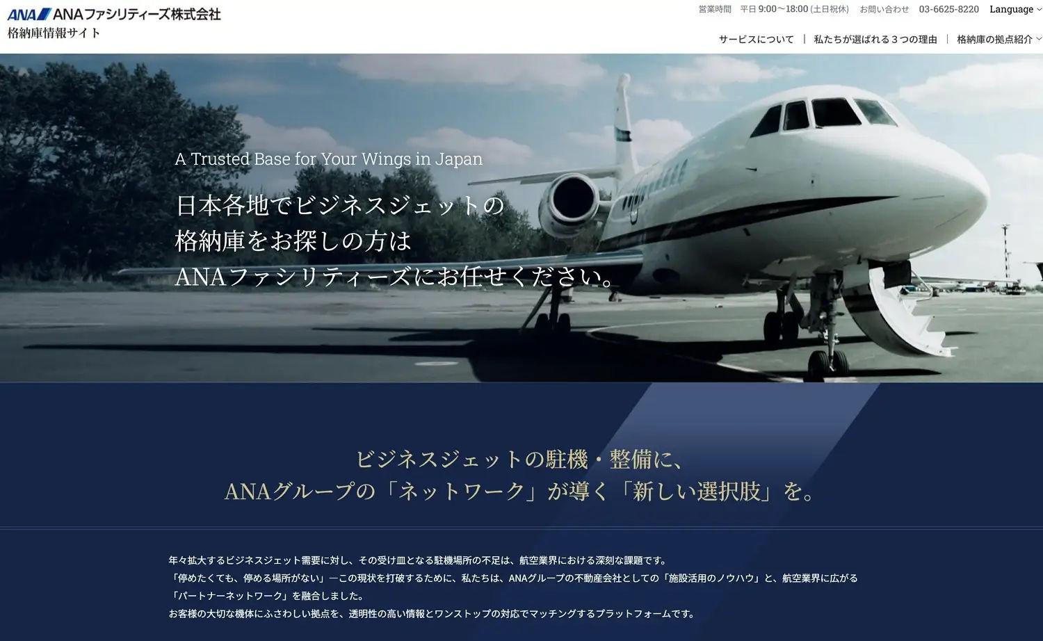 ANAファシリティーズ、ビジネスジェットの格納庫情報を一元化した専用プラットフォームを開設