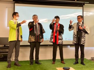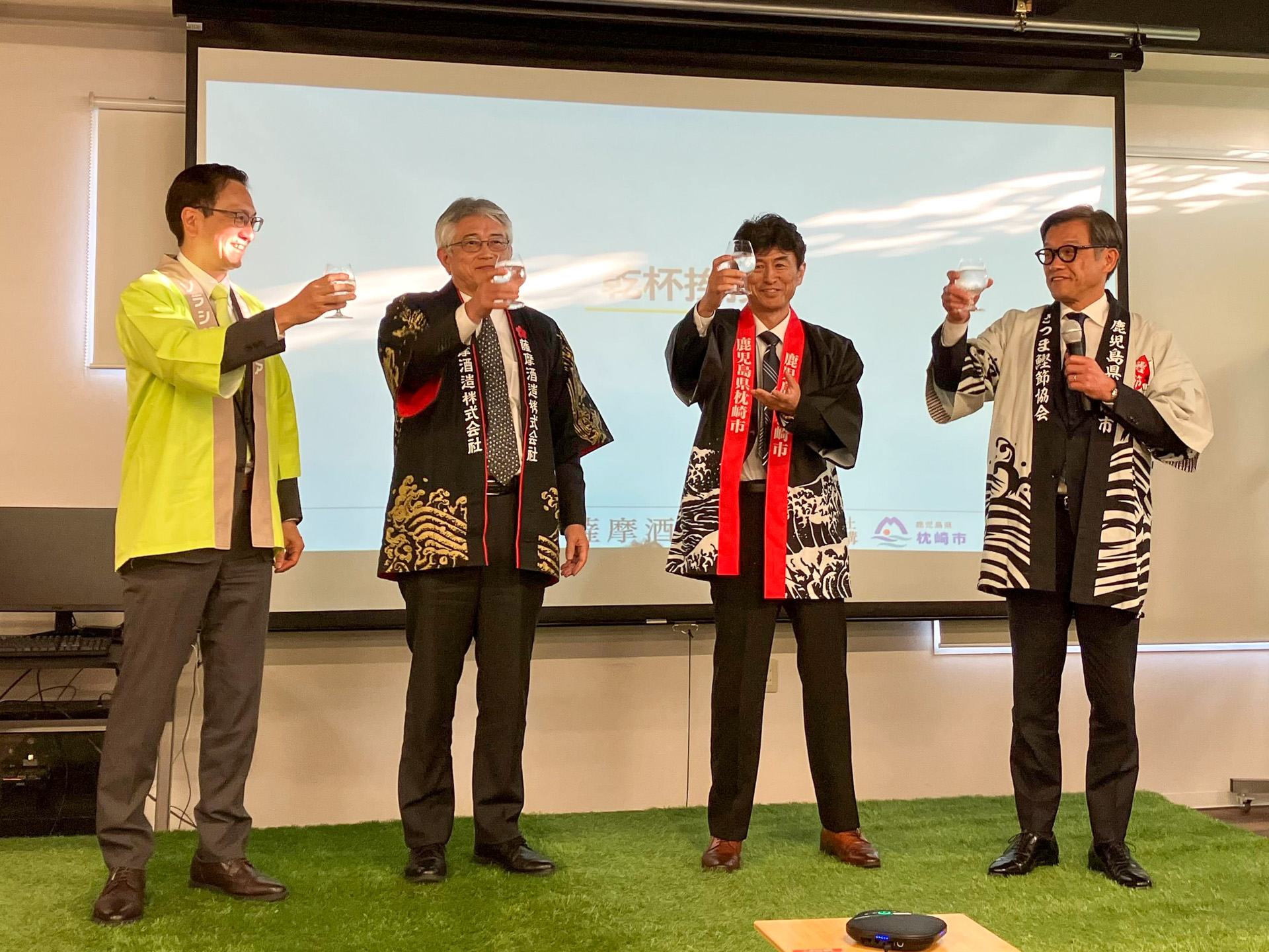代表者による乾杯。左から、株式会社ソラシドエア 代表取締役社長 山岐真作氏、薩摩酒造株式会社 代表取締役社長 吉本義久氏、一般社団法人地域商社推進機構 代表理事 下竹重則氏、鹿児島県枕崎市 市長 前田祝成氏。