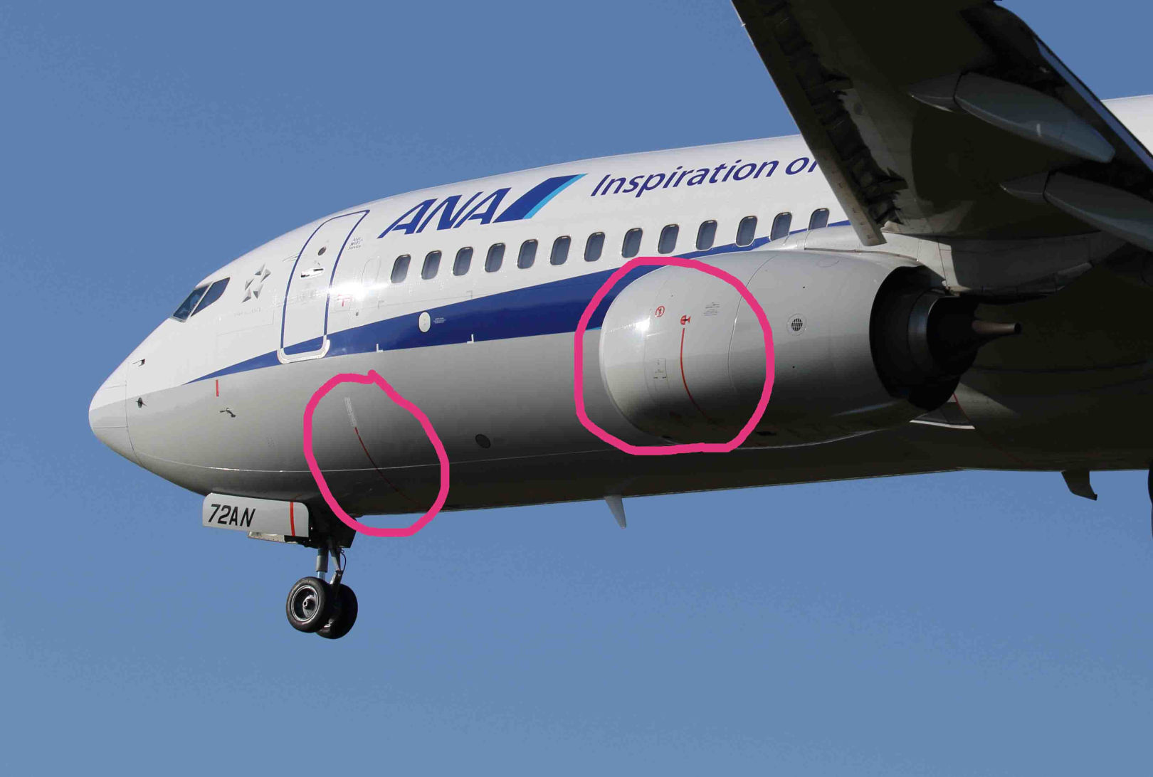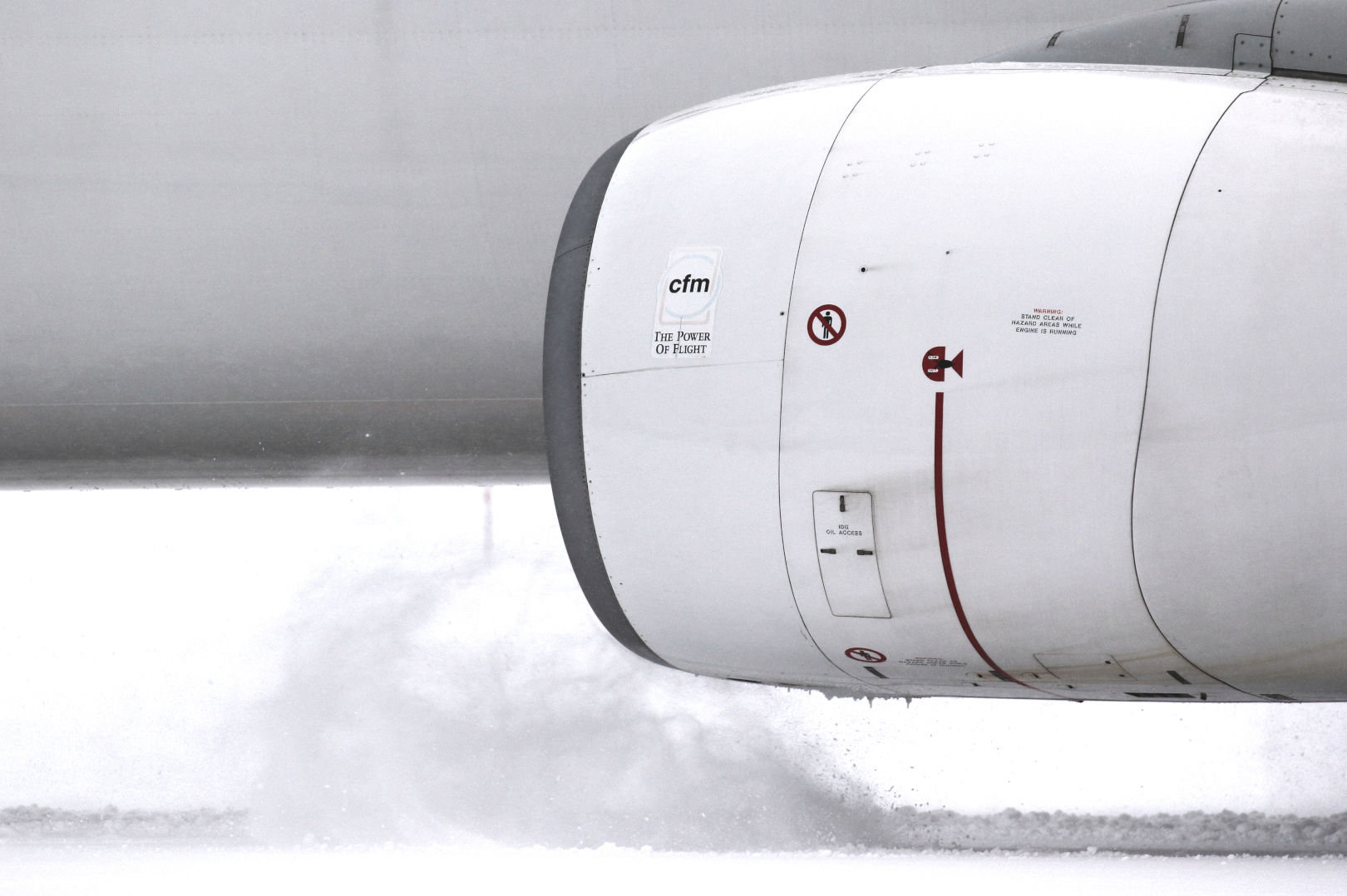 地面からの高さが低い737では、エンジン側面や胴体側面に運転中のエンジンに近づかないようにという警告マークがついている。