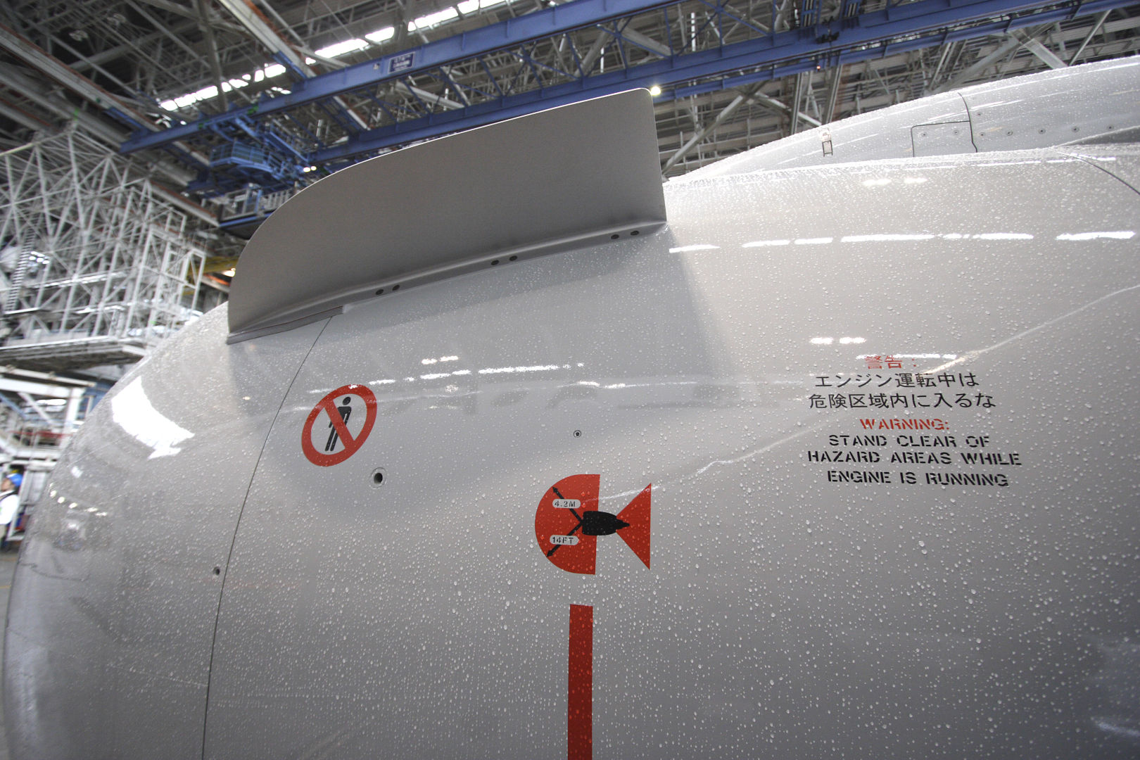 737NGのCFM56エンジンの警告マーク。エンジン運転中には赤線より前方、半径4.2mの範囲が危険範囲であると書かれている。