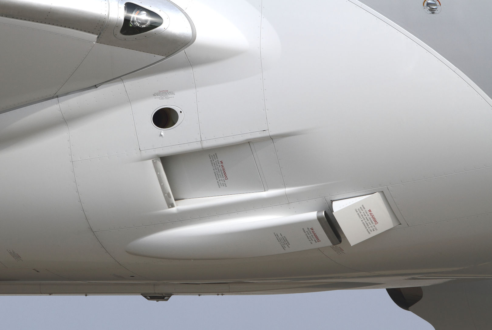 787の与圧空調用空気取入口。下のキャビン用には異物を吸い込まないためのデフレクターがあるが、上の熱交換機用にはない。