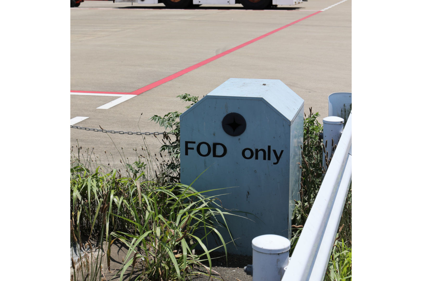 地上の小石などFODがエンジンに吸い込まれることがないよう、成田空港エプロンには専用のごみ箱が設置されている。