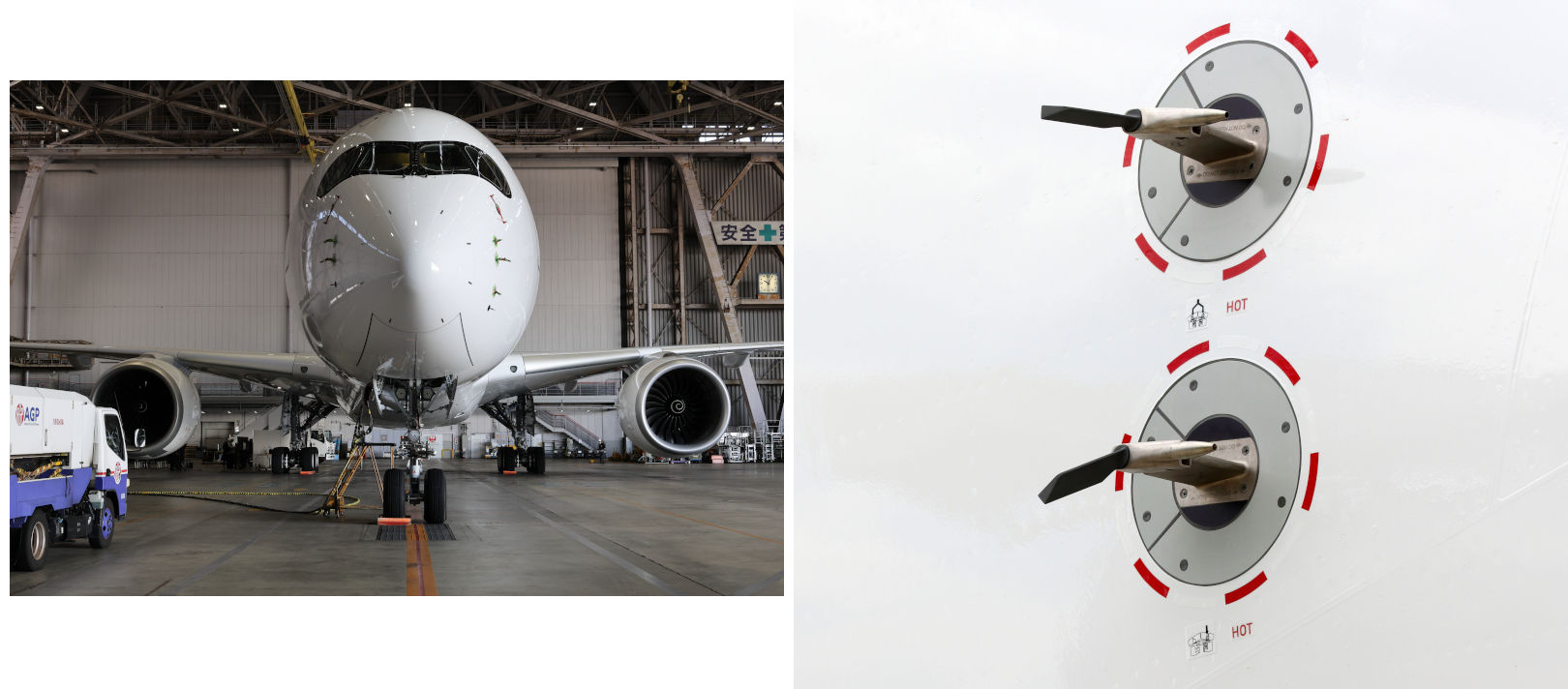 A350の機首を取り囲むように、多数のセンサーやプローブがついている。