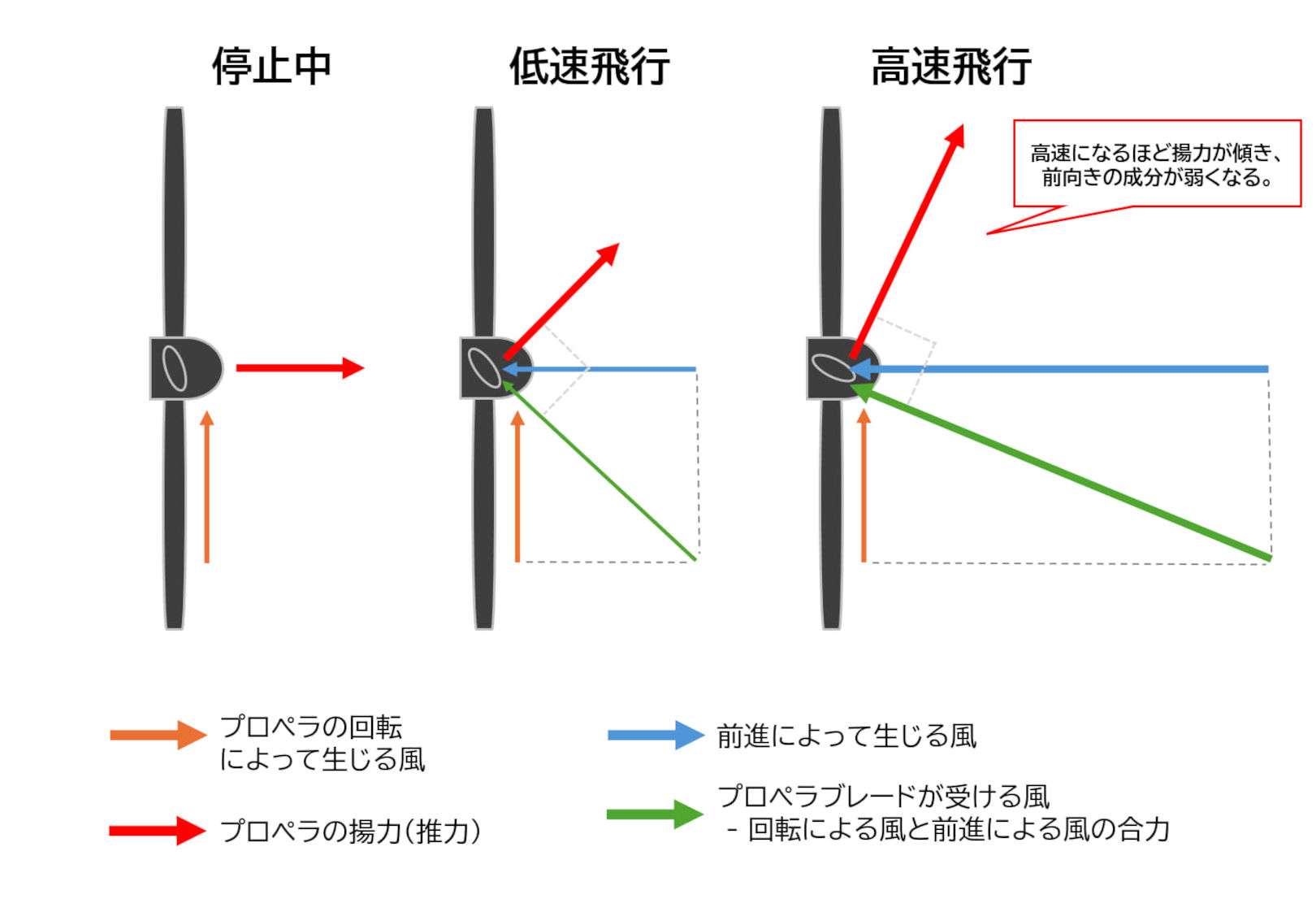 プロペラ機の場合、前進速度が増してブレードの角度が大きくなるほど発生する揚力の方向も傾き、推力となる前向きの成分は小さくなっていく。